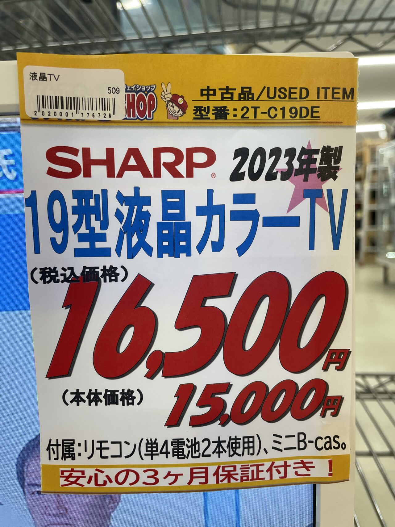 シャープ 19型液晶カラーTV 2T-C19DE 2023年製 付属:リモコン(単4電池2本使用)、ミニB-cas 安心3か月保証付き!!!! 価格¥16500(税込)