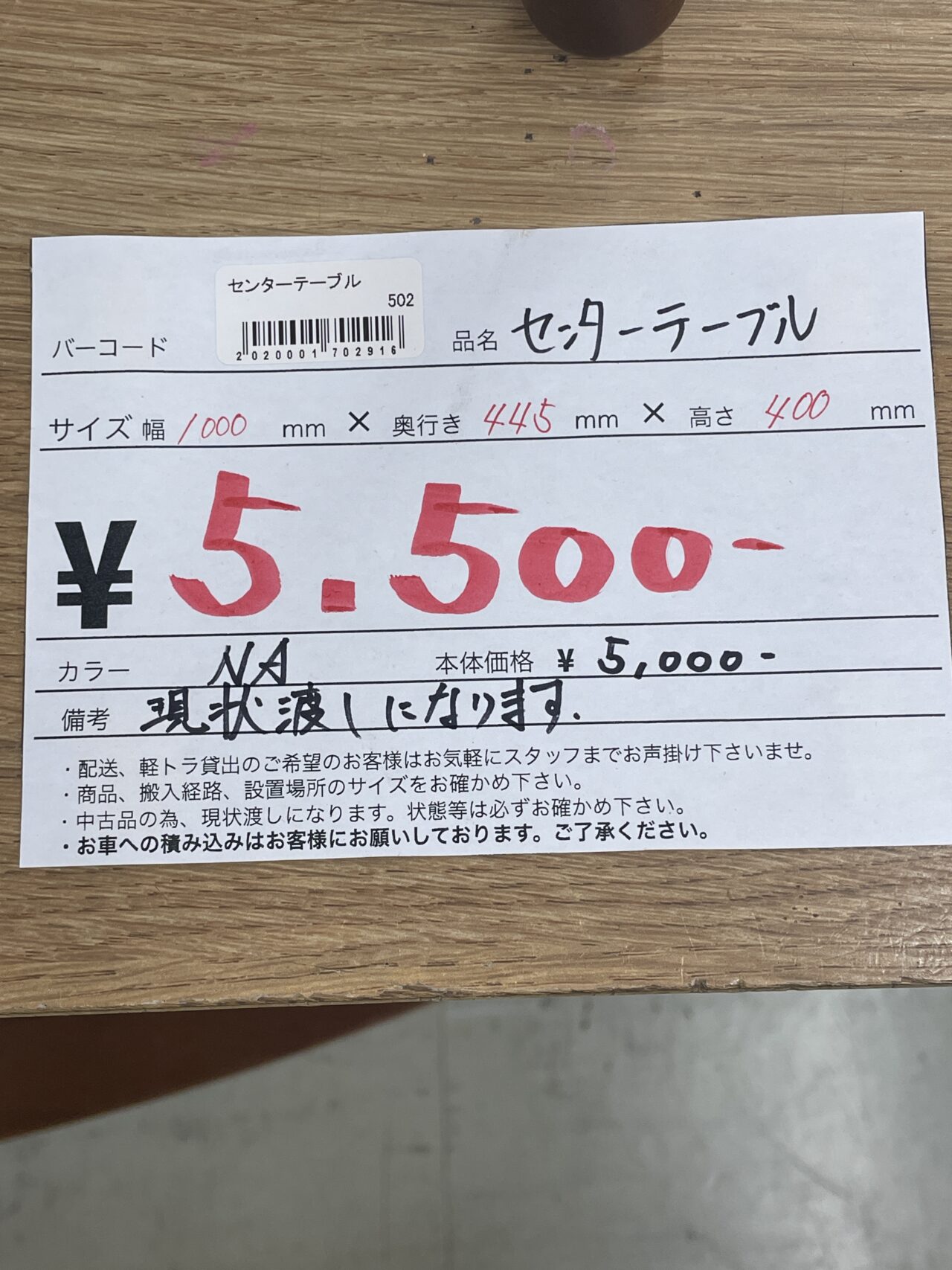 センターテーブル NA サイズ幅1000mm×奥行き445mm×高さ400mm ※現状渡しとなります。 価格¥5500(税込)