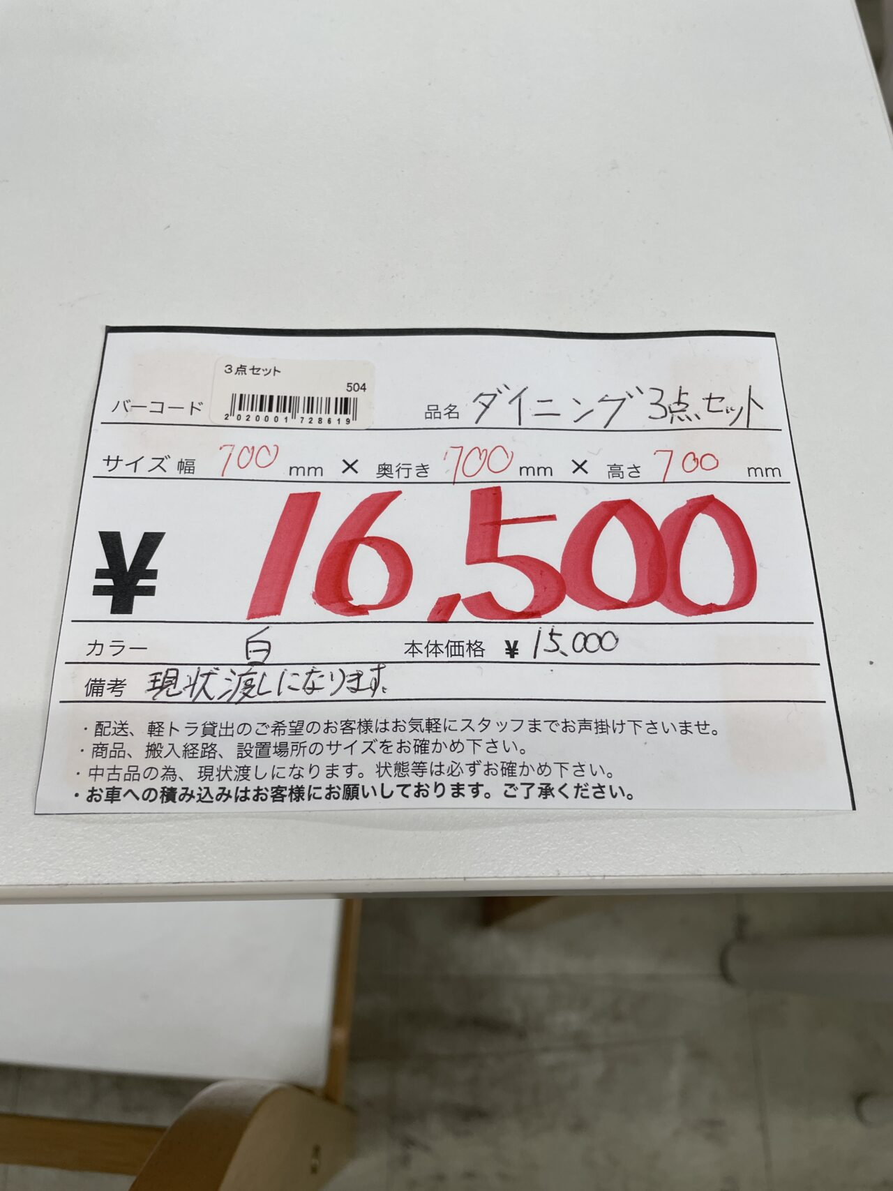 ダイニング3点セット 白 サイズ幅700mm×奥行き700mm×高さ700mm 現状渡しとなります。 価格¥16500(税込)