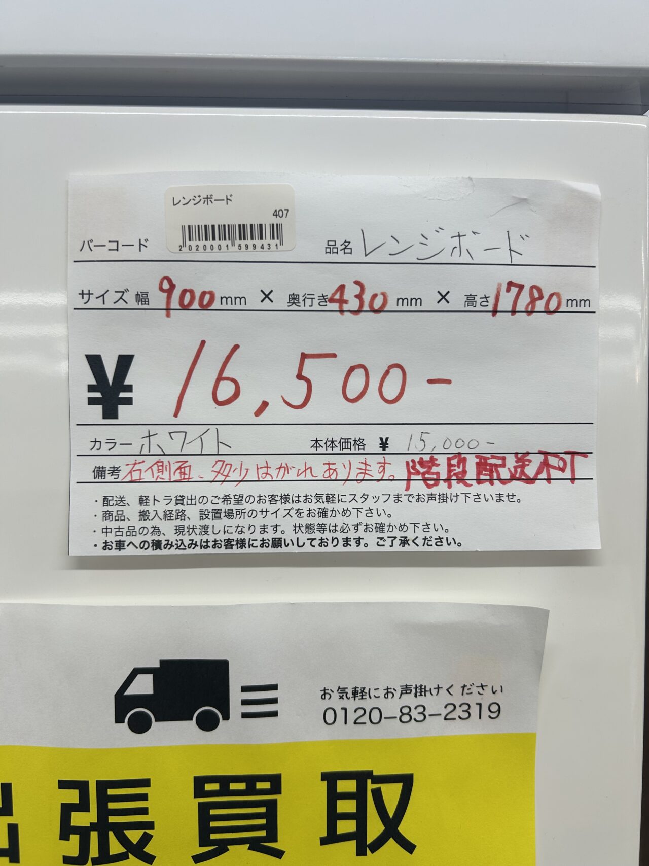 レンジボード ホワイト サイズ幅900mm×奥行き430mm×高さ1780mm ※右側面、多少の剥がれがあります。 階段配送不可。 価格¥16500(税込)