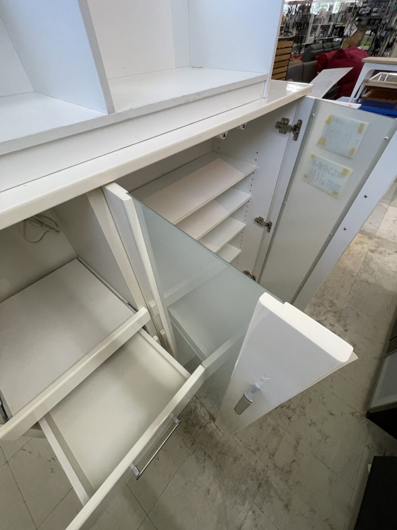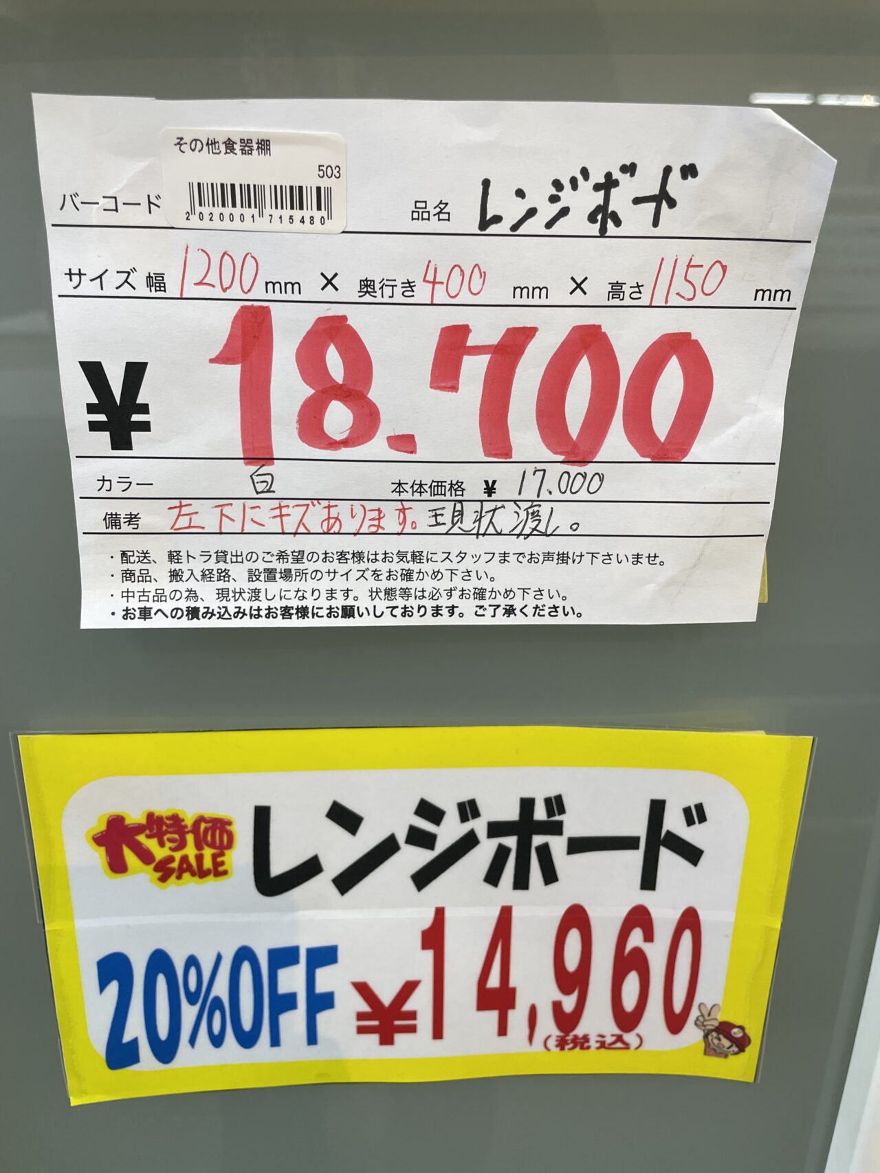 レンジボード 白 (20%OFF) サイズ幅1200mm×奥行き400mm×高さ1150mm ※左下にキズ有ります。 現状渡しとなります。 価格¥14960