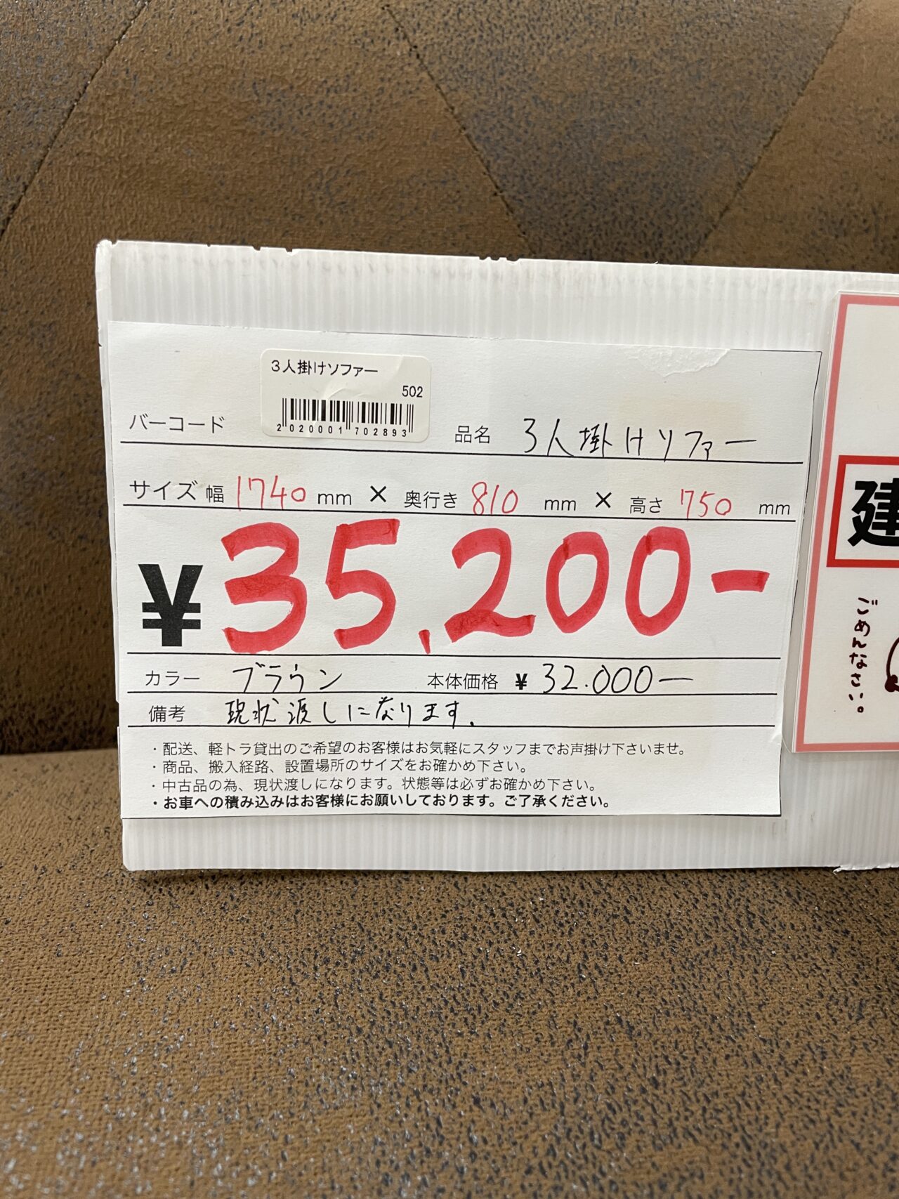 三人掛けソファ (ブラウン) サイズ幅1740mm×奥行き810mm×高さ750mm 建物前までの配送限定となります。