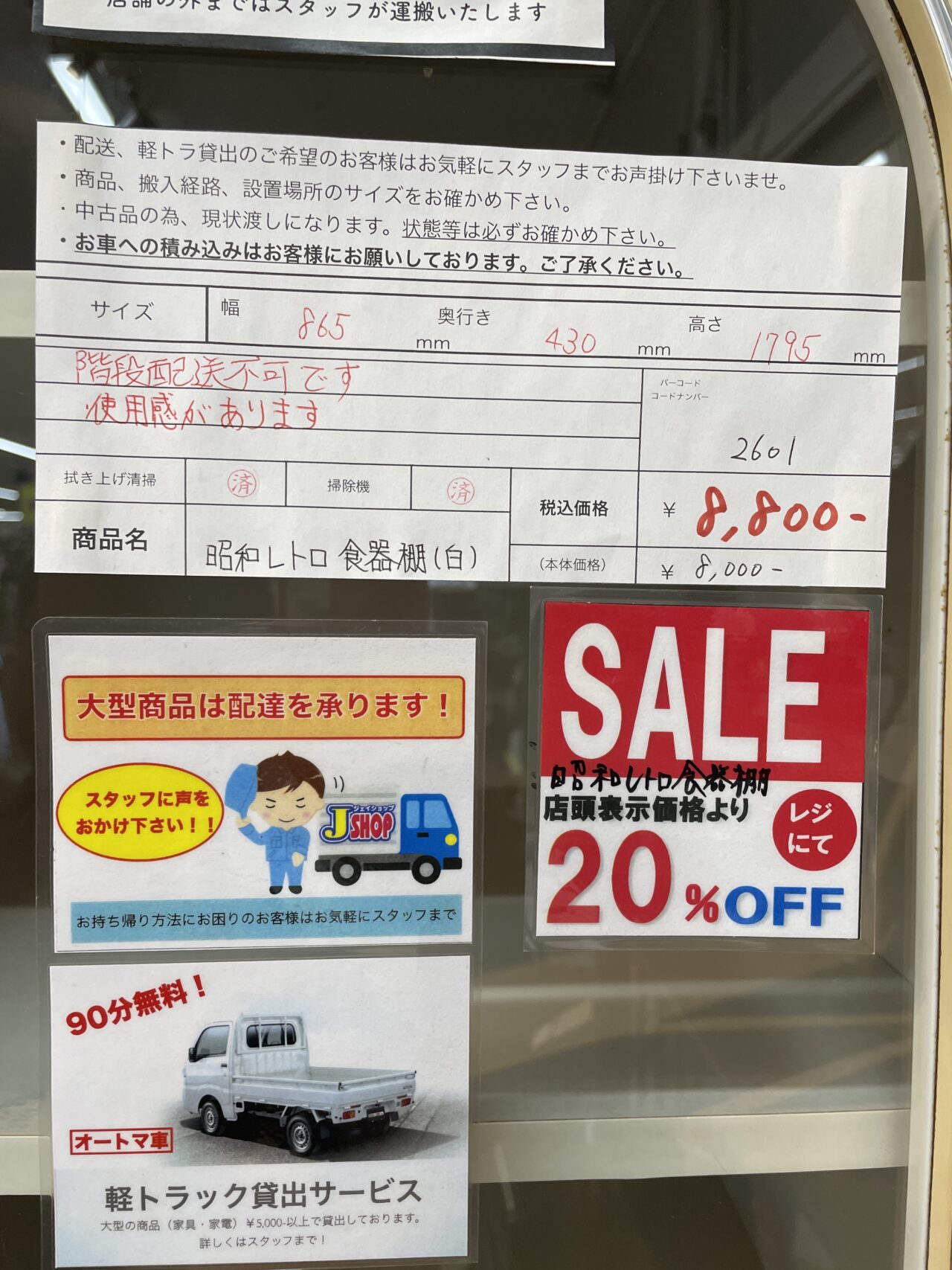 昭和レトロ食器棚 白 サイズ幅865mm×奥行き430mm×高さ1795mm ※使用感があります 階段配送不可 価格¥8800(税込)