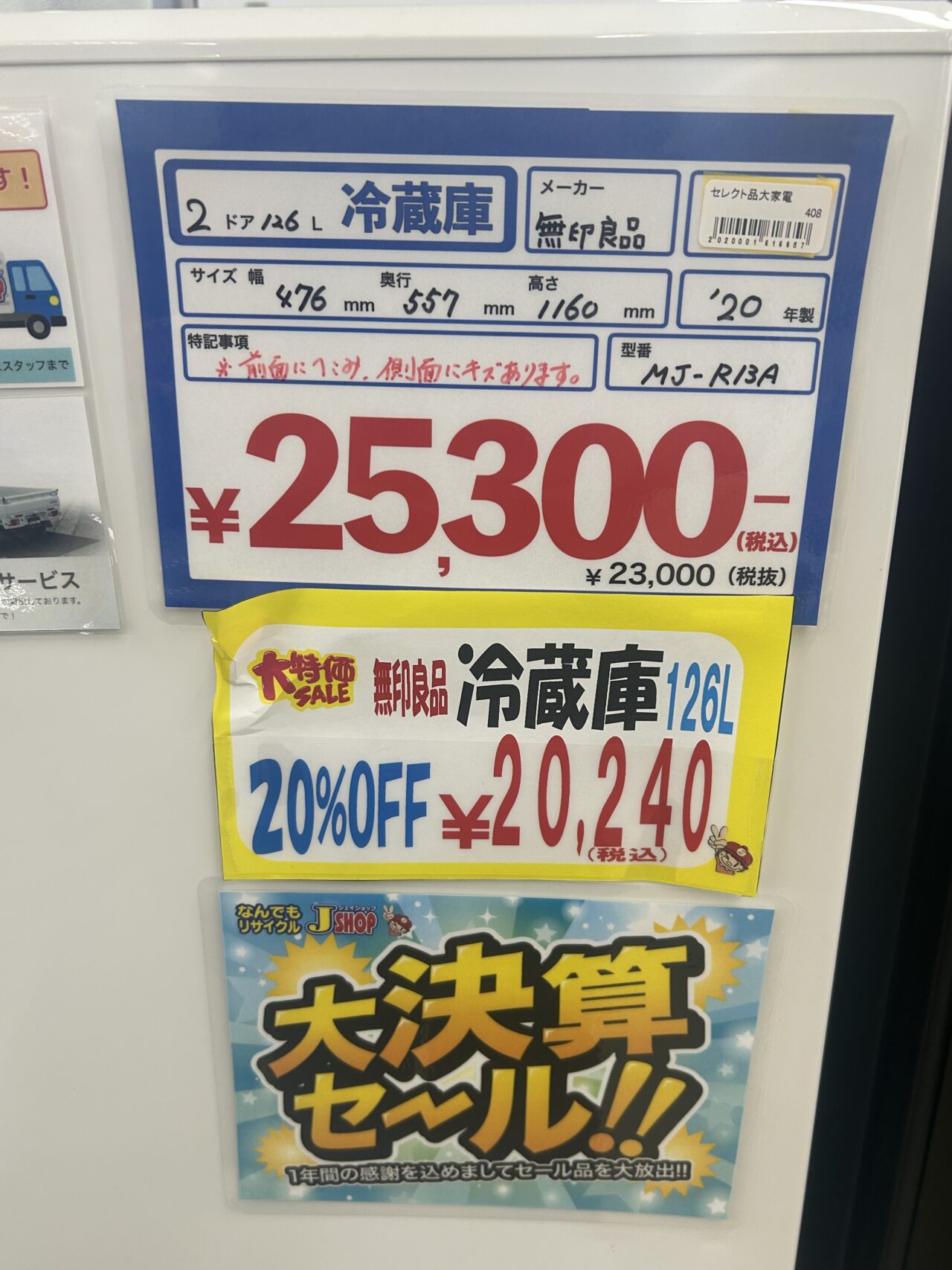 無印良品 2ドア冷蔵庫 MJ-R13A 2020年製 126ℓ サイズ幅476mm×奥行557mm×高さ1160mm ※前面にへこみ、側面にキズがあります。 安心6か月保証付き!!!! 価格¥25300→¥20240(税込)