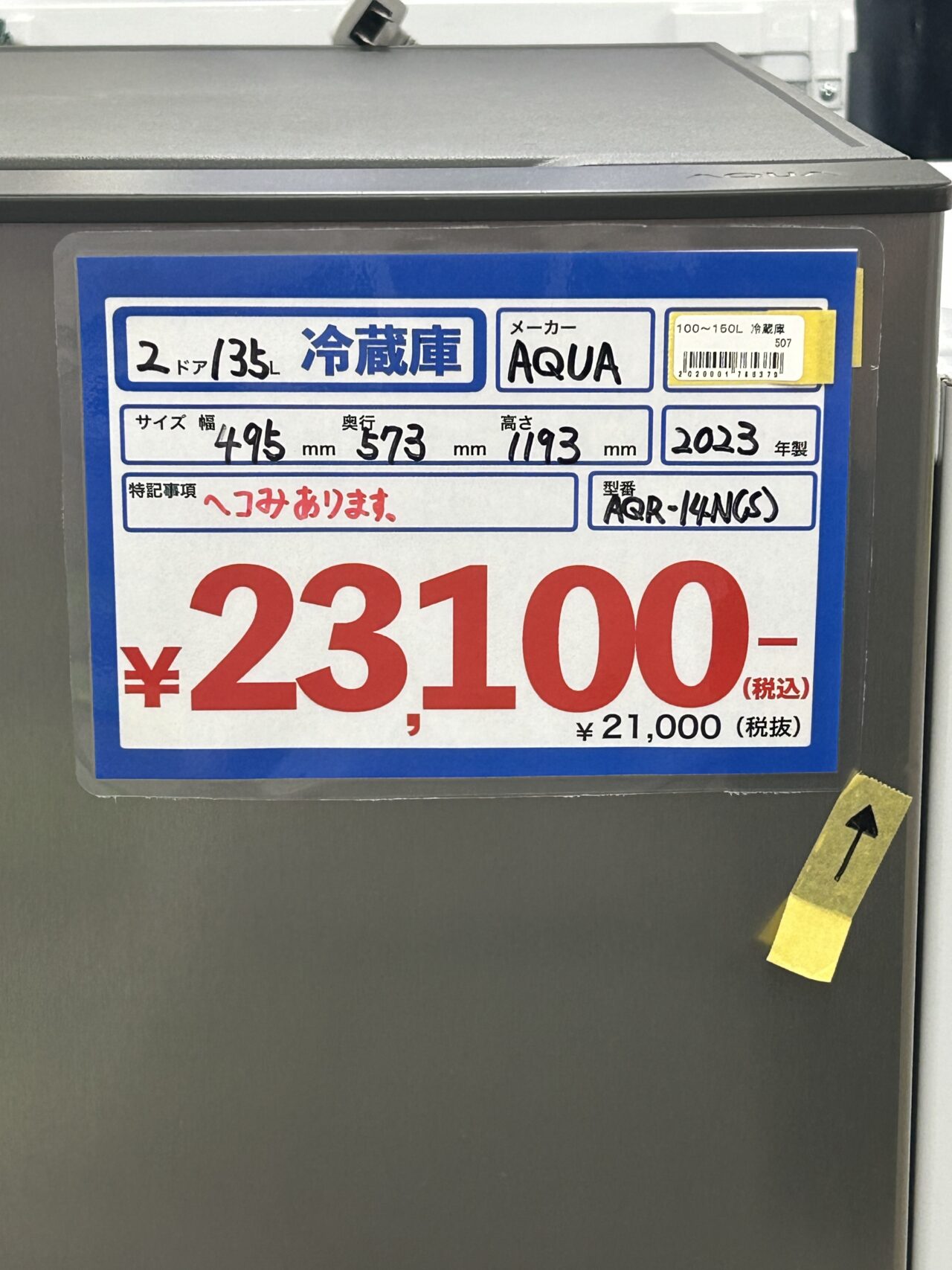 AQUA 2ドア冷蔵庫 AQR-14N 2023年製 135ℓ サイズ幅495mm×奥行573mm×高さ1193mm ※ヘコみ有ります。 価格¥23100(税込)